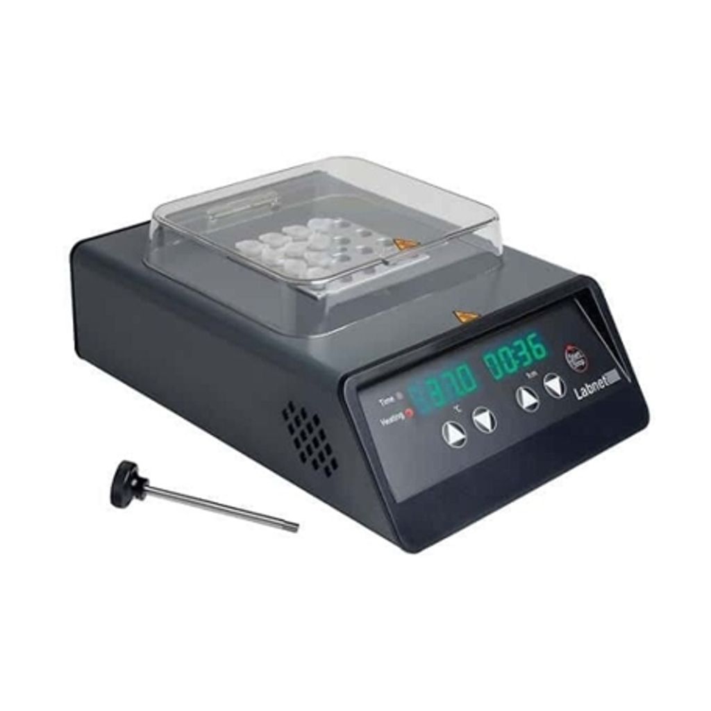 BAÑO SECO, CONTROL DIGITAL TEMPERATURA AMBIENTE +5 A 150ºC, PARA UN BLOQUE, RELOJ DE 1 A 99 Hrs 59 min. MEDIDAS TOTALES: 21 x 29 x 12cm. PESO: 3.2Kg . OPERA CON 115V. MARCA LABNET