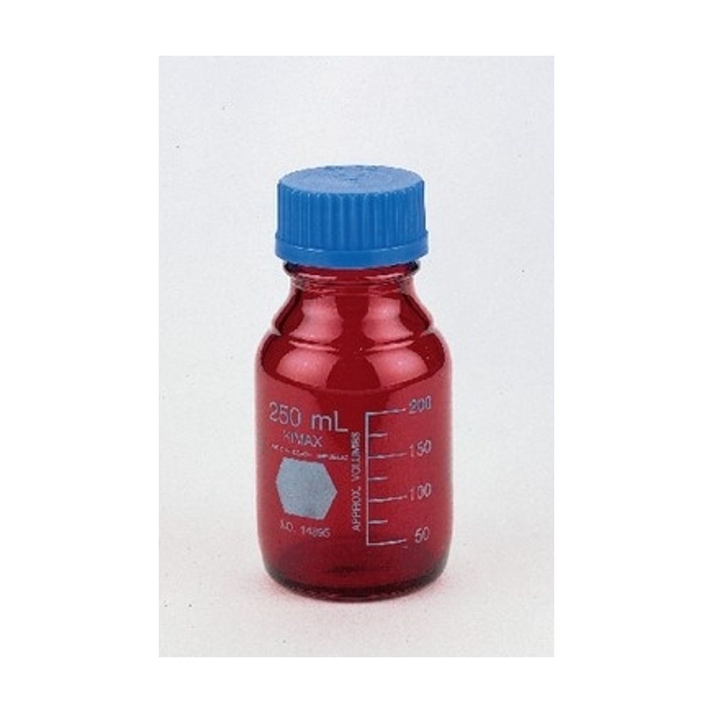 FRASCO DE VIDRIO AMBAR RAYSORB, 250ML CON TAPA ROSCA AZUL CAT.14399-250 KIMAX