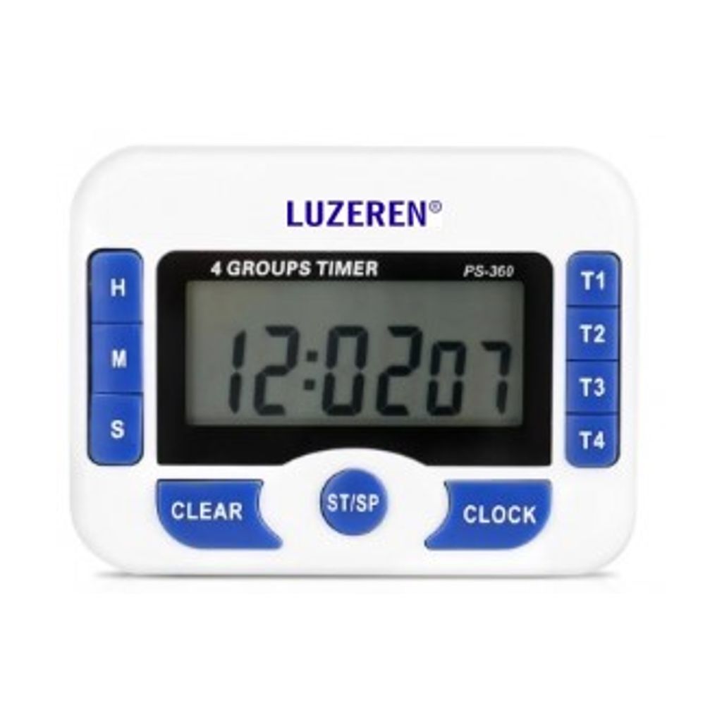RELOJ DE 4 CANALES, DIGITOS EN HR/ MIN/ SEG, AM/PM. CRONOMETRO ASCENDENTE Y DESCENDENTE DE 99 Hr, 59 min, 59 seg. COLOR BLANCO CON AZUL. MEDIDAS: 93 x 70 x 30mm. PESO: 95g. OPERA CON 2 BATERIAS LR44. MARCA LUZEREN