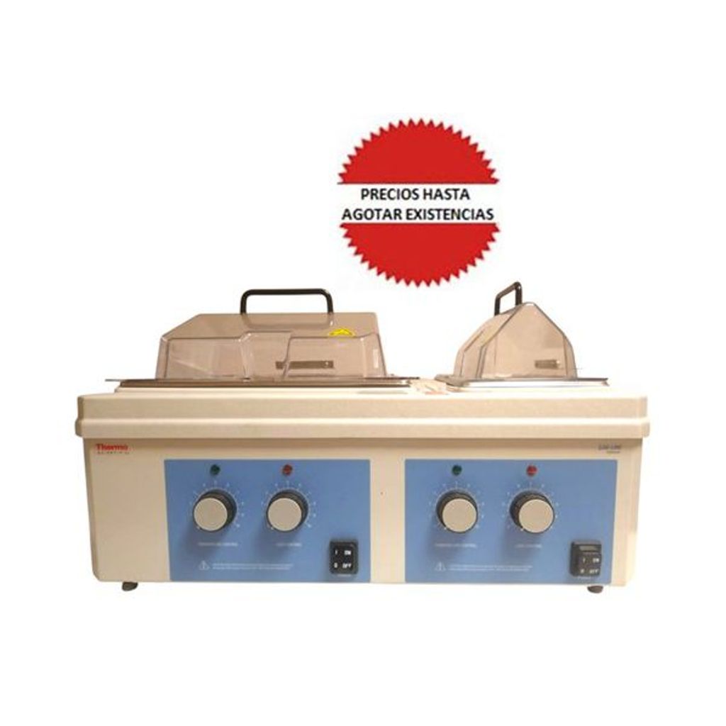 BAÑO MARIA CON TINA DOBLE: 5 Y 10L, CONTROL ANALOGO. RANGO DE TEMPERATURA : AMBIENTE A 75°C ( ABIERTO) Y 100°C CON TAPA DE ACRILICO. MEDIDAS DE LAS TINAS: 5.9 (15) x 6 (15) x 11.8 (30) pulg (cm) Y 12.9 (33) x 6 (15) x 11.8 (30) pulg (cm). MEDIDAS TOTALES : 24.2 (62) x 16.4 (42) x 8.9 (23) pulg (cm). REQUIERE 120V, 1000Watts. THERMO SCIENTIFIC # 2253
