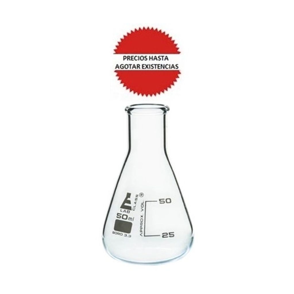 MATRAZ ERLENMEYER 50ml. VIDRIO BORO, BOCA ANGOSTA. GRAD. ESMALTE BLANCO. EISCO