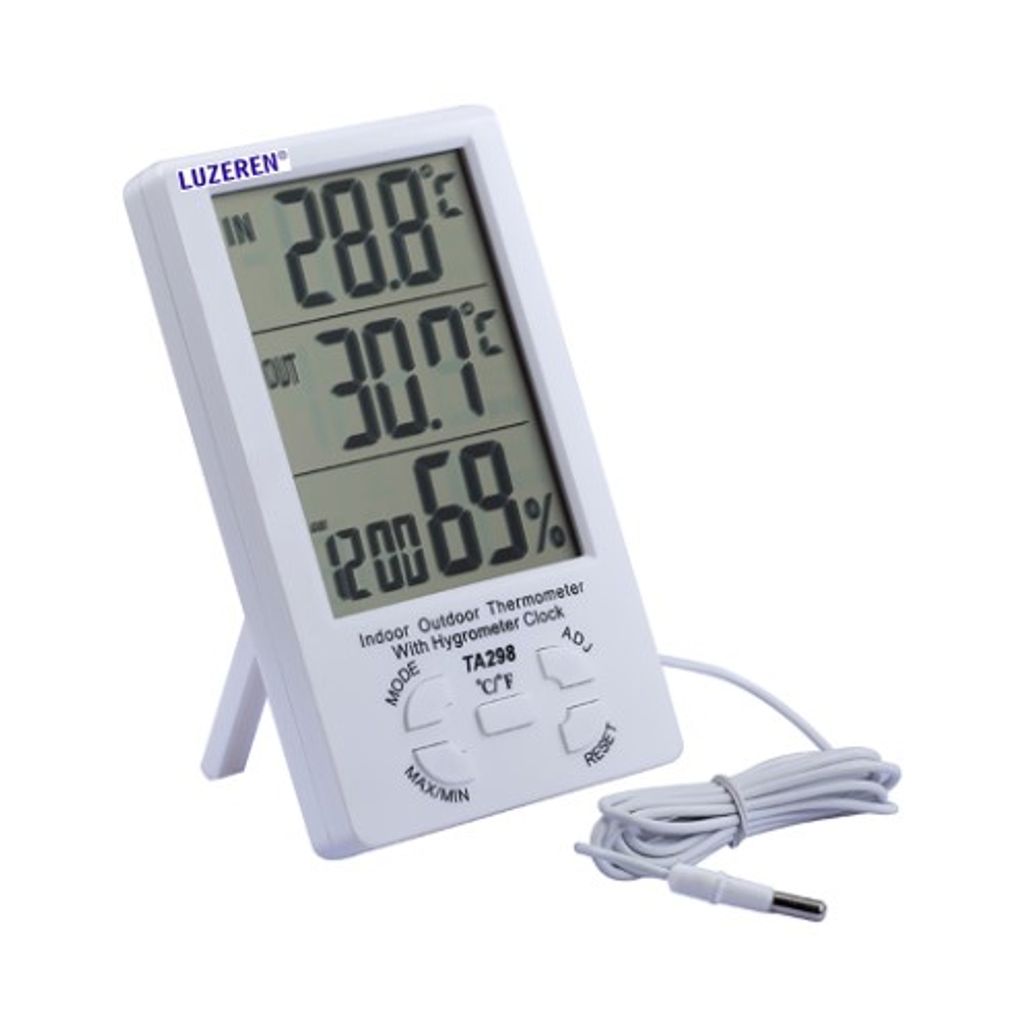 TERMOHIGROMETRO ELECTRONICO PARA OPERAR EN MODOS IN/OUT Y MIN/MAX. RANGOS : IN 0 A 50°C, +/-1°C, OUT -40 A 70°C, +/-0.1°C. HUMEDAD 10-99% RH +/-5% . RESOL 1%. TIENE SENSOR EXTERNO. MEDIDAS 120 x 60 x 20mm. OPERA CON 1 BATERIA DE 1.5V (AAA). MARCA LUZEREN